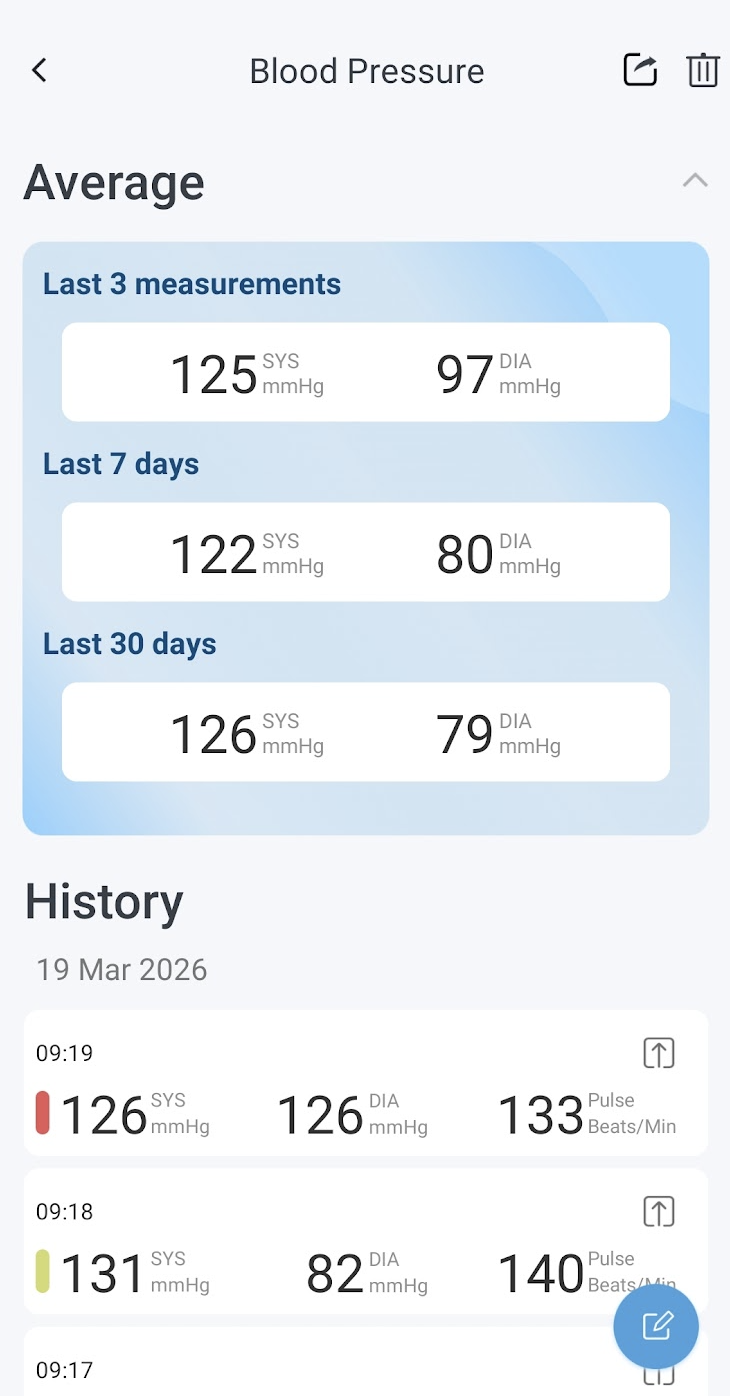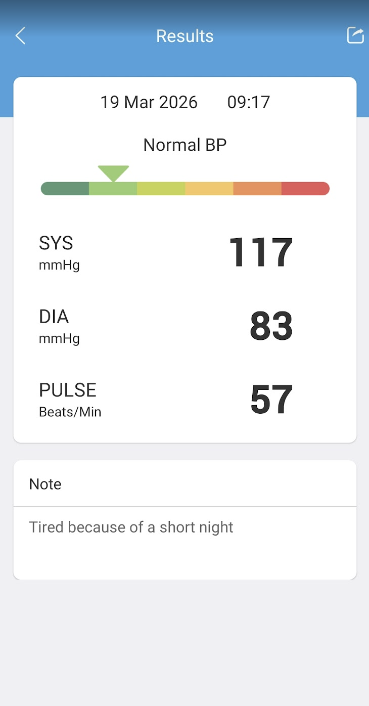 To add to your measurement and give your doctor more information about your condition at the time of measurement, you can add information about your mood and activity, and add notes.