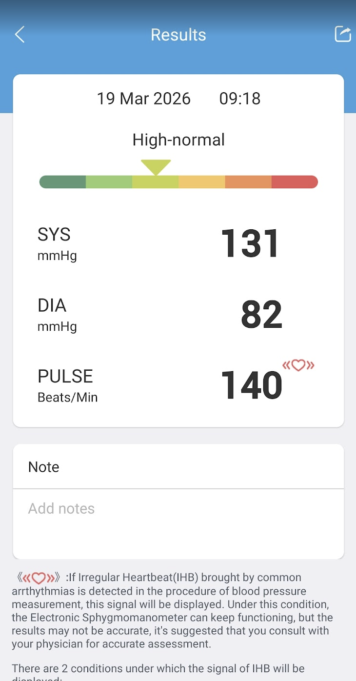 When an irregular heartbeat is detected, measurement of blood pressure may be inaccurate. A new measurement is recommended. Learn more about irregular heartbeat detection.