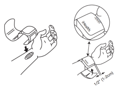 - Place your hand, palm facing upward, in front of you and wrap the cuff around the bare wrist, 2 cm below the fold of the wrist. If the blood pressure monitor is placed properly, the iHealth logo will be placed at the bottom.