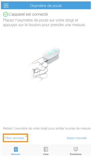 Each of the pulse oximeter's users can then retrieve their offline measurements from the Filter data menu in the app.