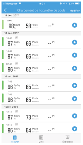 Measures taken without the app being open on an iHealth account (called offline measurements) are stored in memory in the pulse oximeter. The device can memorise up to 100 measurements. After that, the oldest measurements are replaced by new measurements.