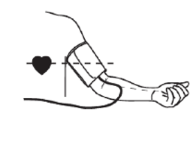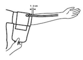 Attachez le brassard sur votre bras nu, tuyau vers le bas, environ 2 cm au-dessus du coude. Serrez convenablement (vous devez pouvoir passer 2 doigts entre le brassard et votre bras).