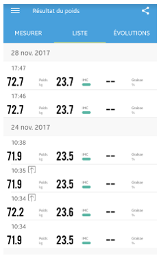 Pour visualiser la liste de toutes vos mesures, allez dans Menu > Poids > Liste.