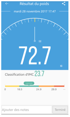 L’indice de masse corporelle et sa classification selon l’échelle OMS sont visibles dans l’application.