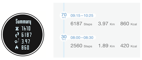 Lorsque vous marchez ou courez pendant plus de 10 minutes sans discontinuer, le iHealth Edge entre dans le mode exercice et en ressort après 5 minutes d'arrêt. Un rapport de cette session d'exercice s'affiche alors à l'écran et est disponible pendant 30 minutes à la suite des autres informations visibles sur le iHealth Edge.