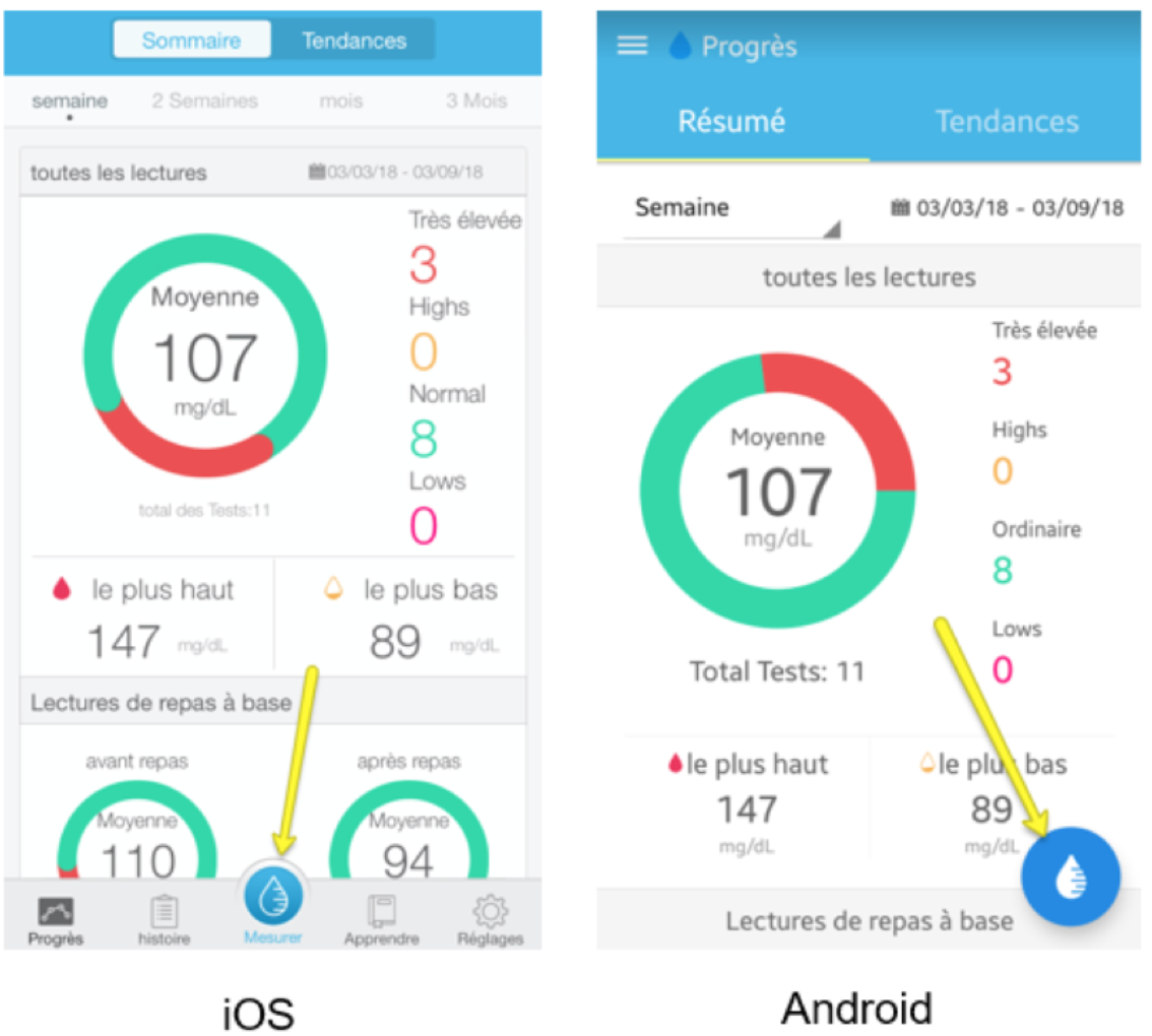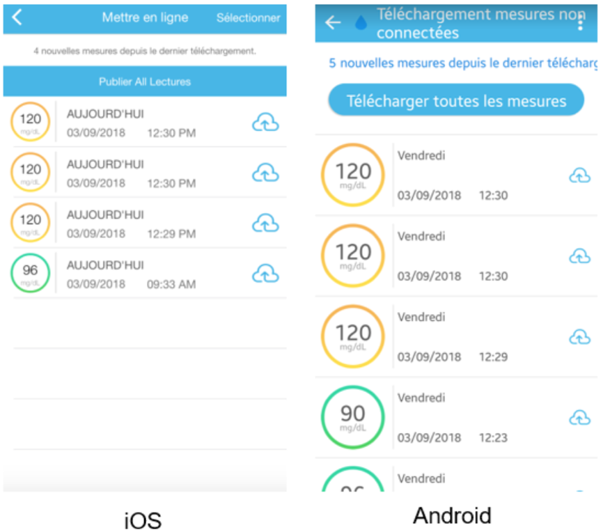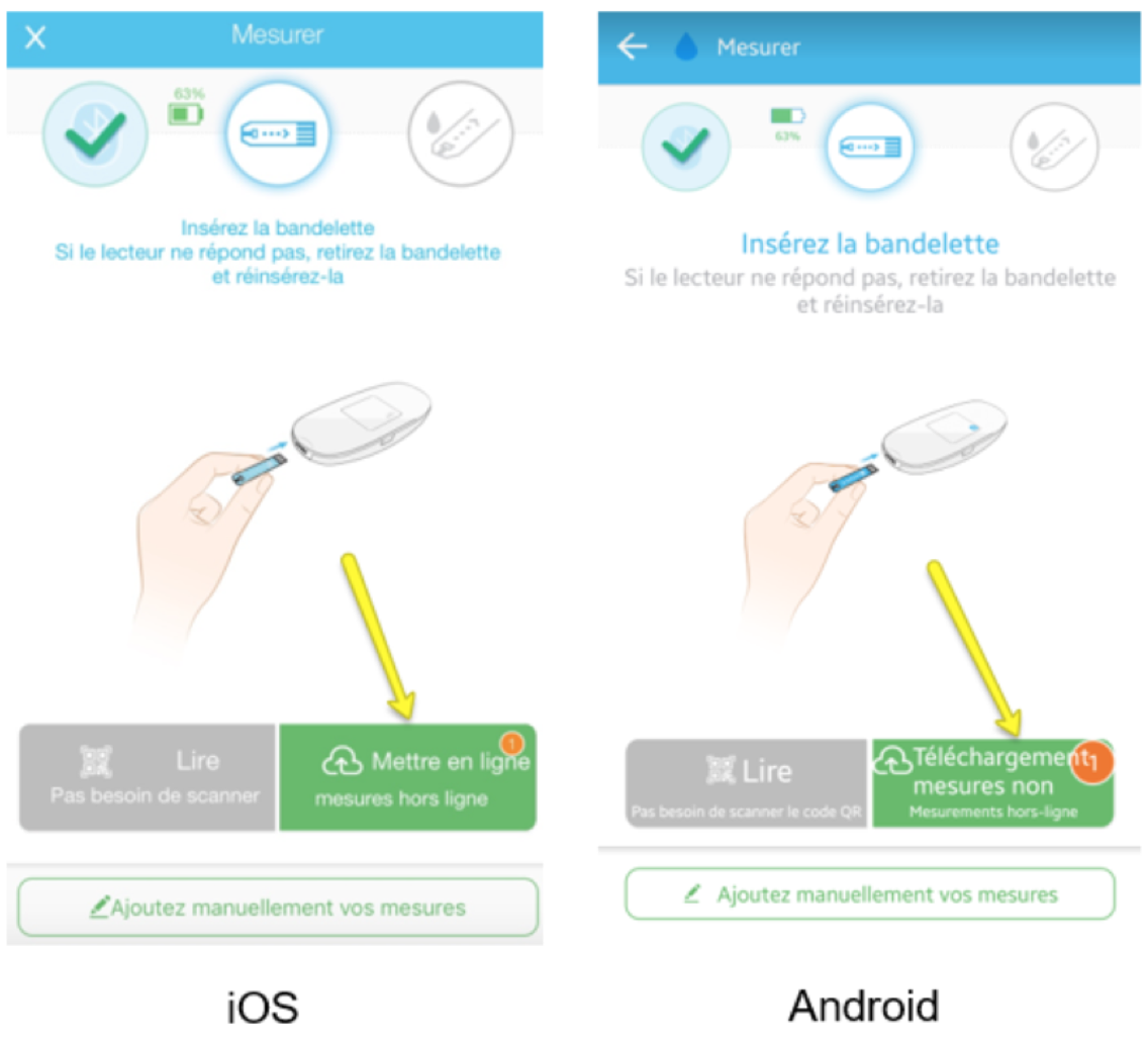 - Una volta che la connessione è stabilita (icona Bluetooth fissa sul suo lettore di glicemia), vada nell’app, premere sul pulsante Mettere in linea le misure non connesse.